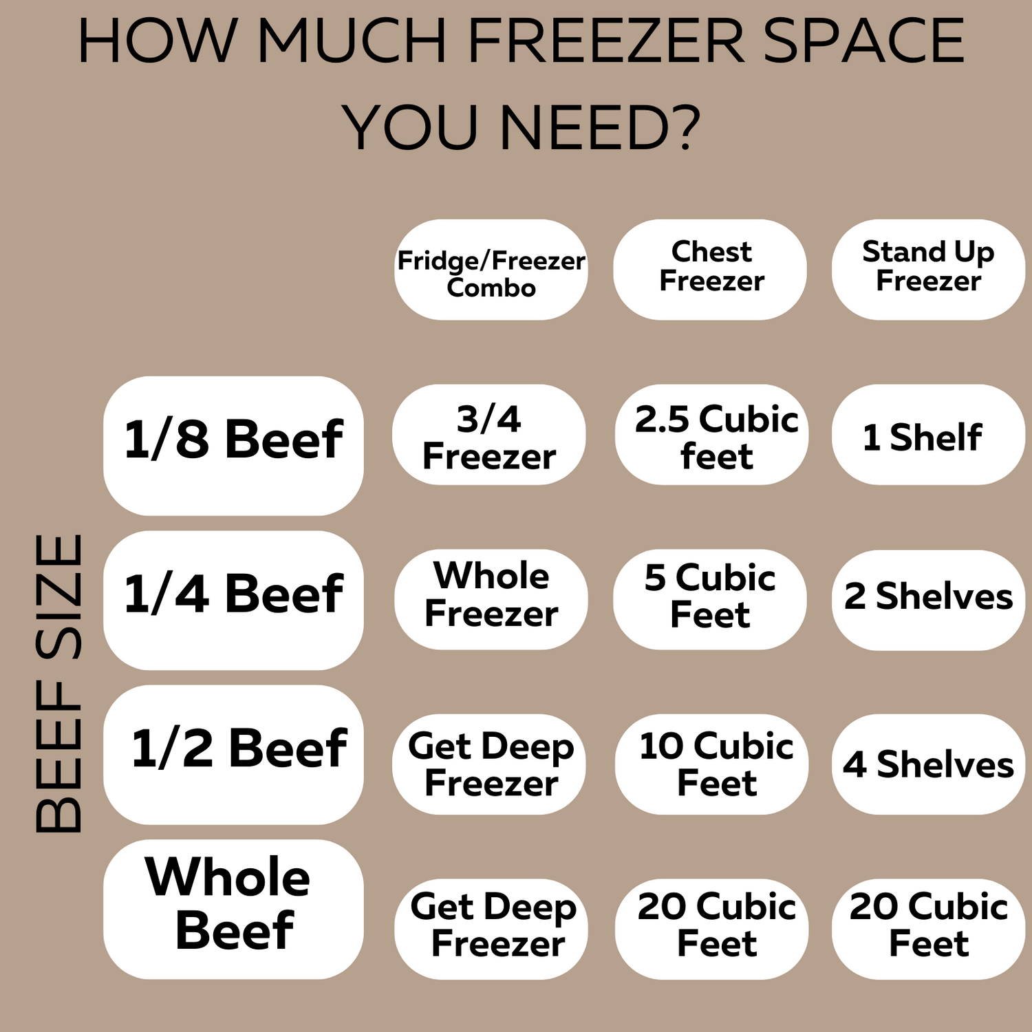 Wondering how much freezer space you'll need? We got you! Use this handy guideline to determine how much freezer space your beef purchase will require.