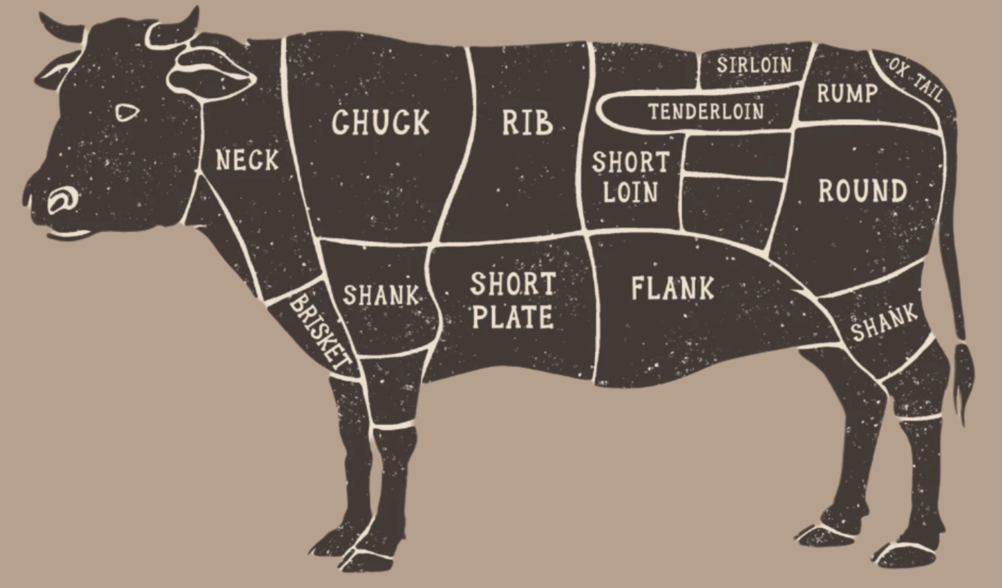 Beef is broken down into "Primal Cuts" (labeled in the diagram to the right). A Primal is a large muscle or group of connected muscles that come off the cow together. Then, these Primals are broken down into the roasts and steaks that you know, or are put to grind for ground beef
